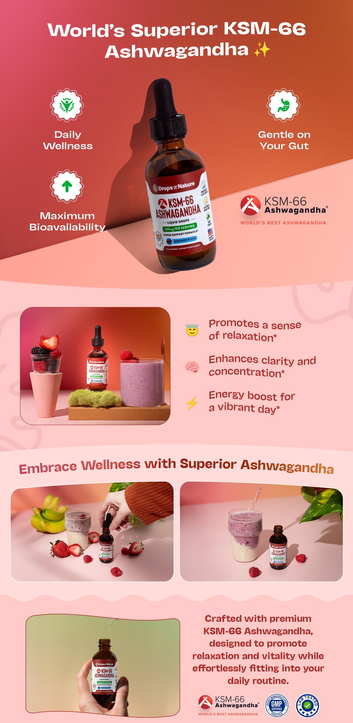 Feel balanced. Think clearly. Live vibrantly. Add our KSM-66 Ashwagandha Drops to your wellness routine and discover what calm energy really feels like.