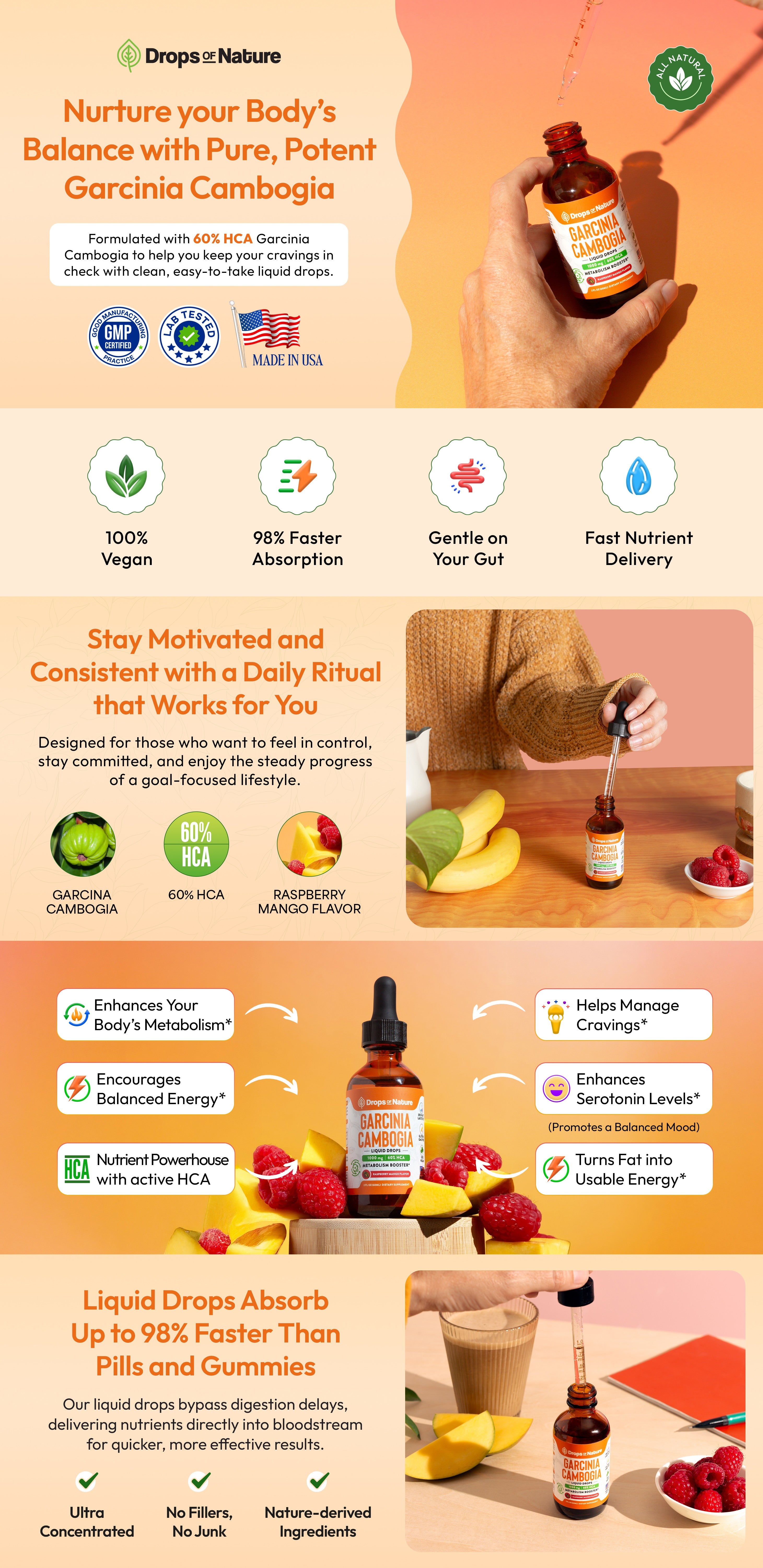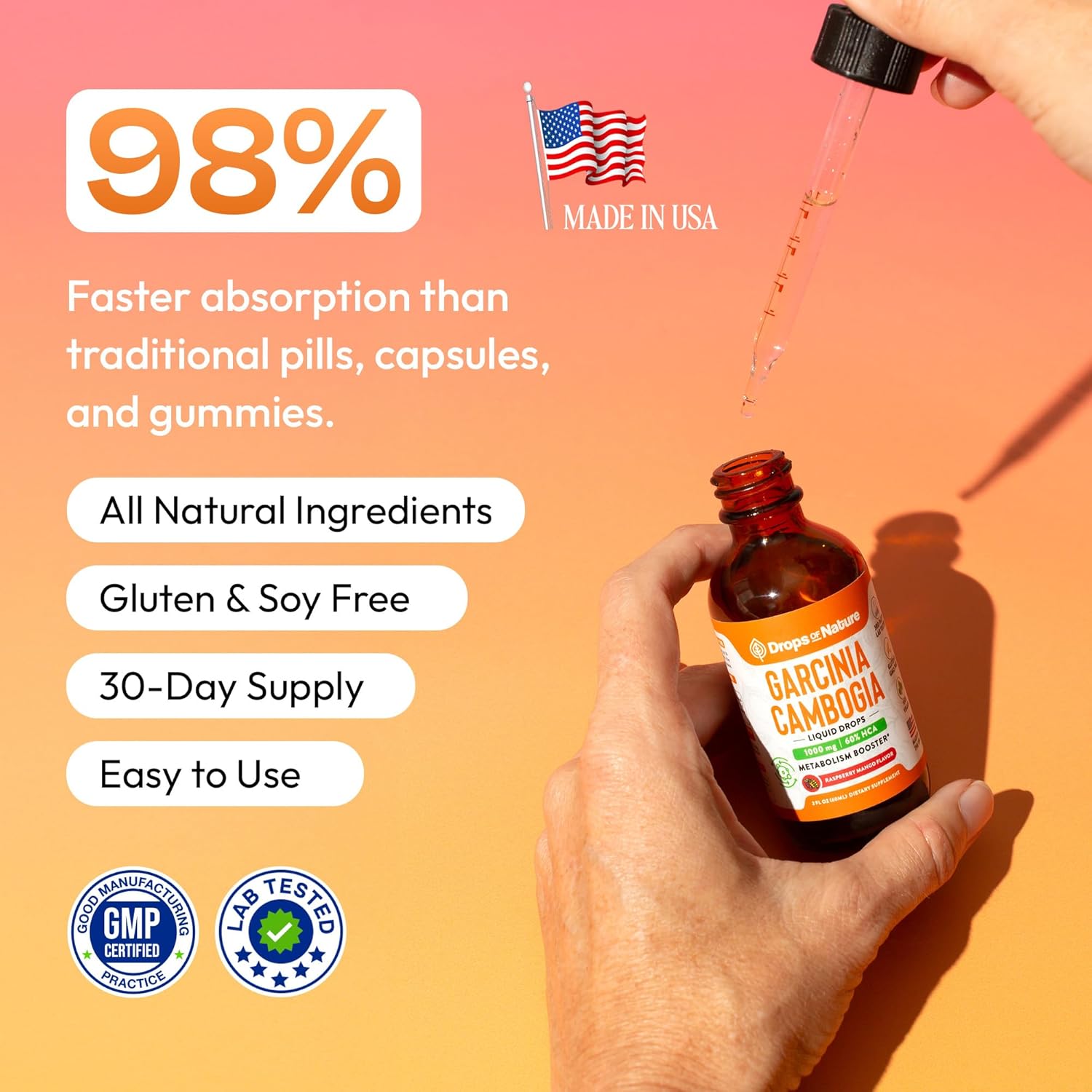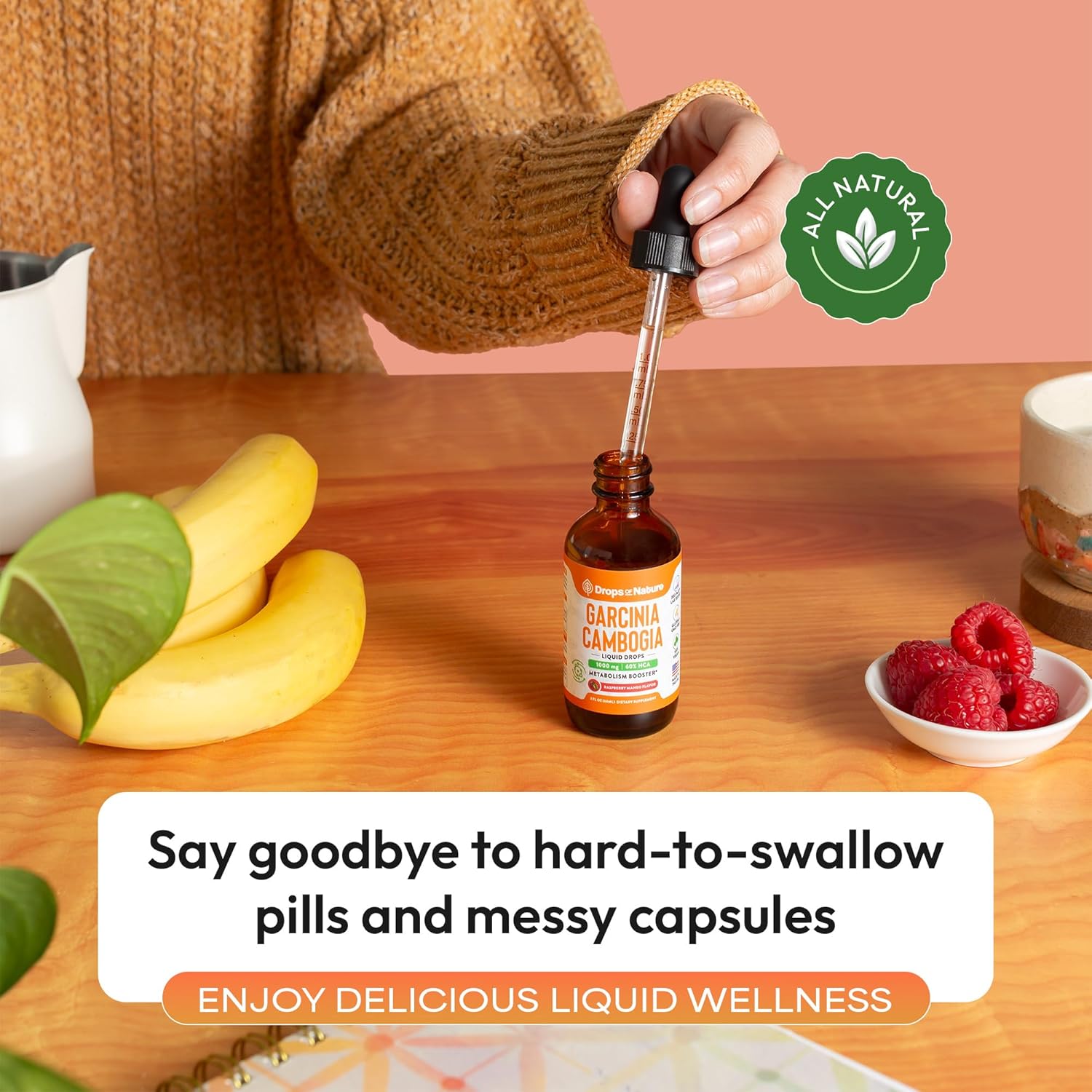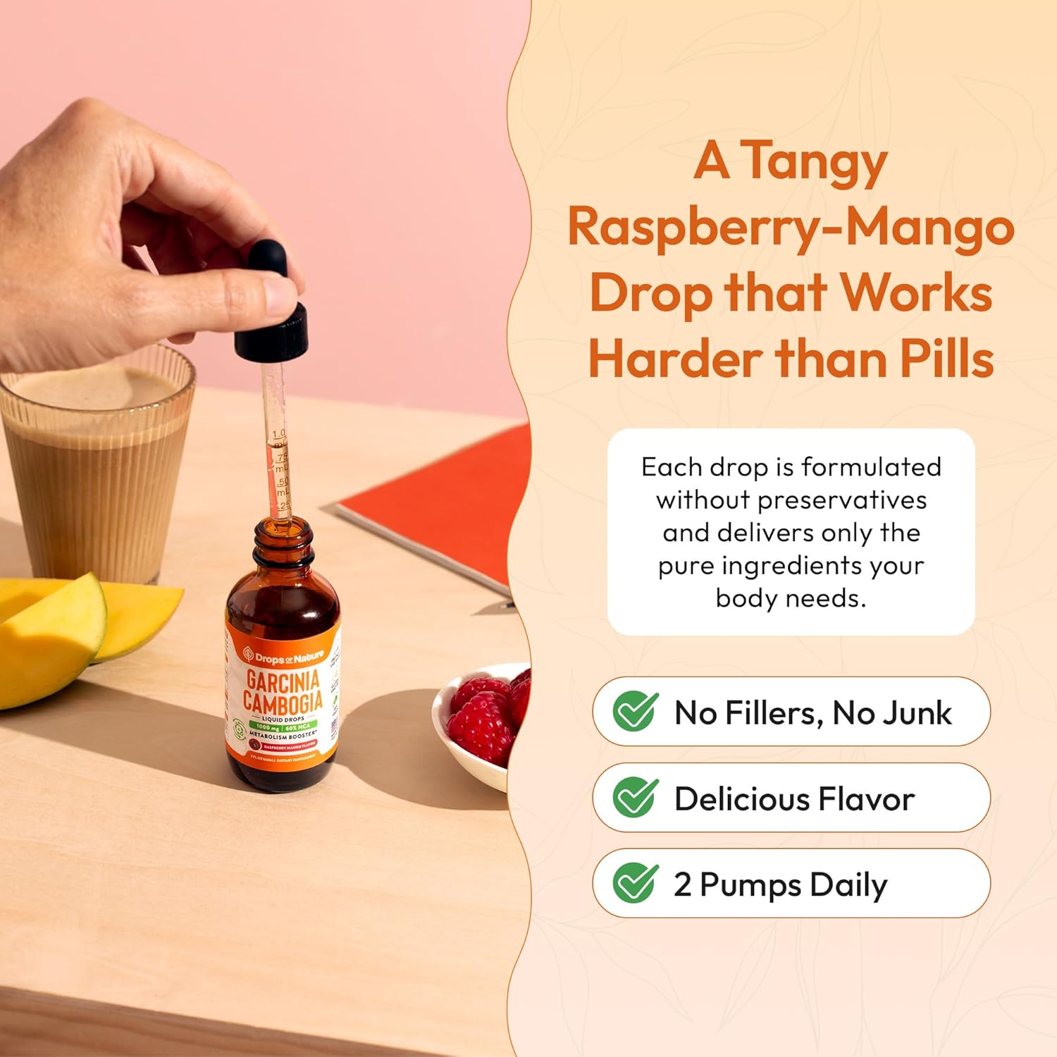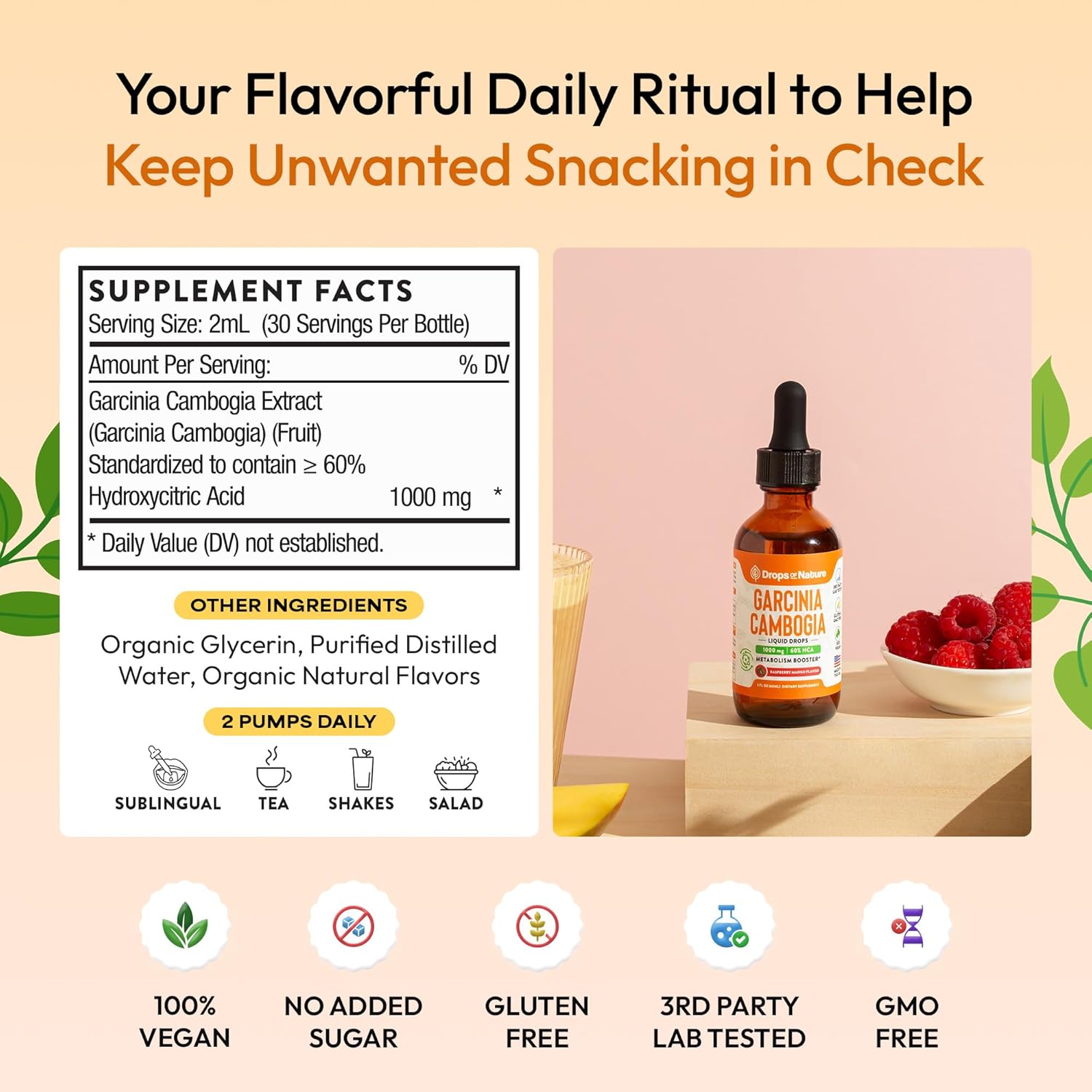 Meet your weight management ally - Drops of Nature Garcinia Cambogia Liquid Drops. With 60% HCA potency, this formula helps suppress cravings, block carbs, and turn stored fat into active energy, all while supporting your mood and overall well-being. If that doesn't sound like a dream come true - we're not sure what does.