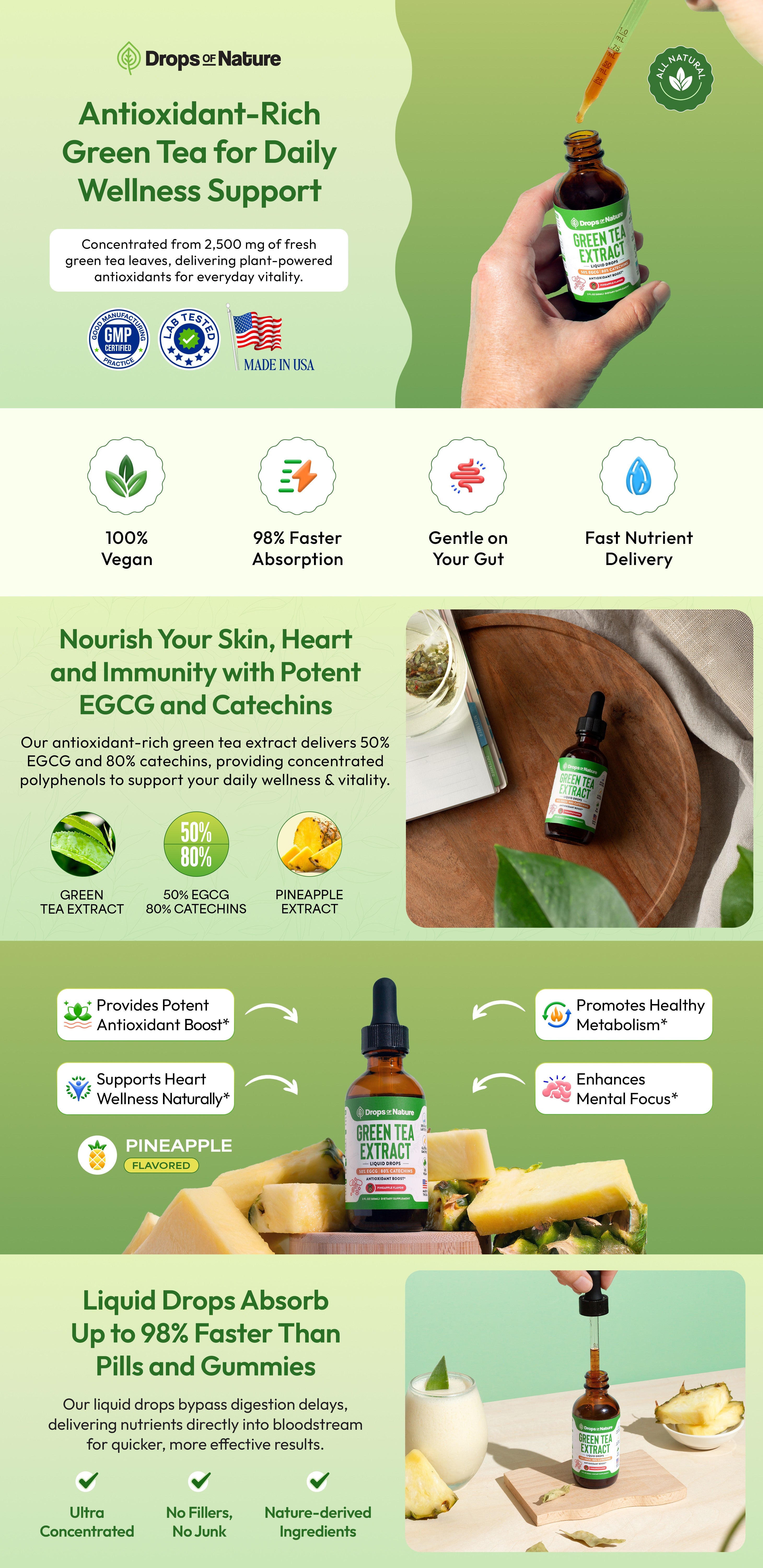 Fuel your body and mind with Green Tea Liquid Drops - a smarter, smoother way to stay energized and focused one delicious drop at a time.