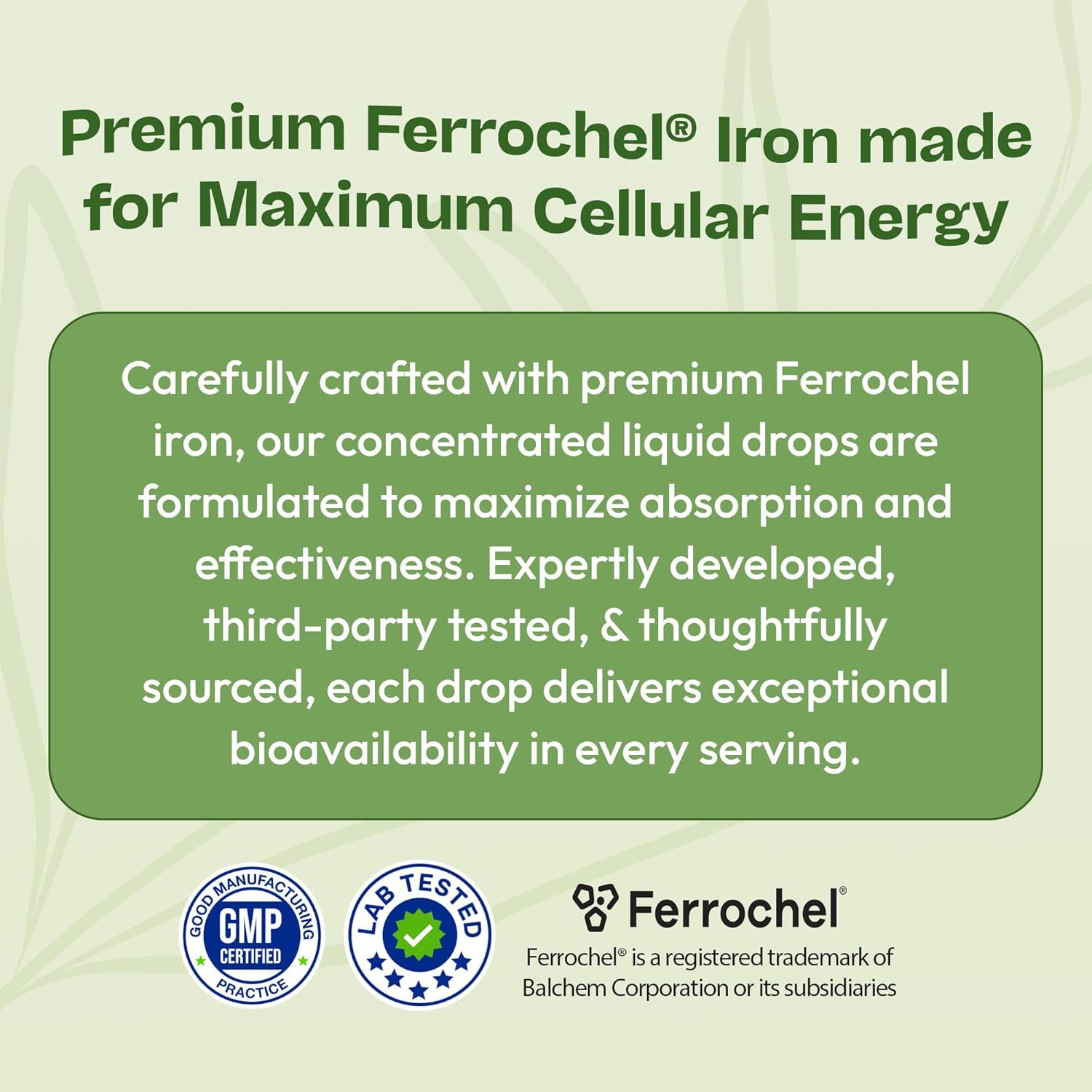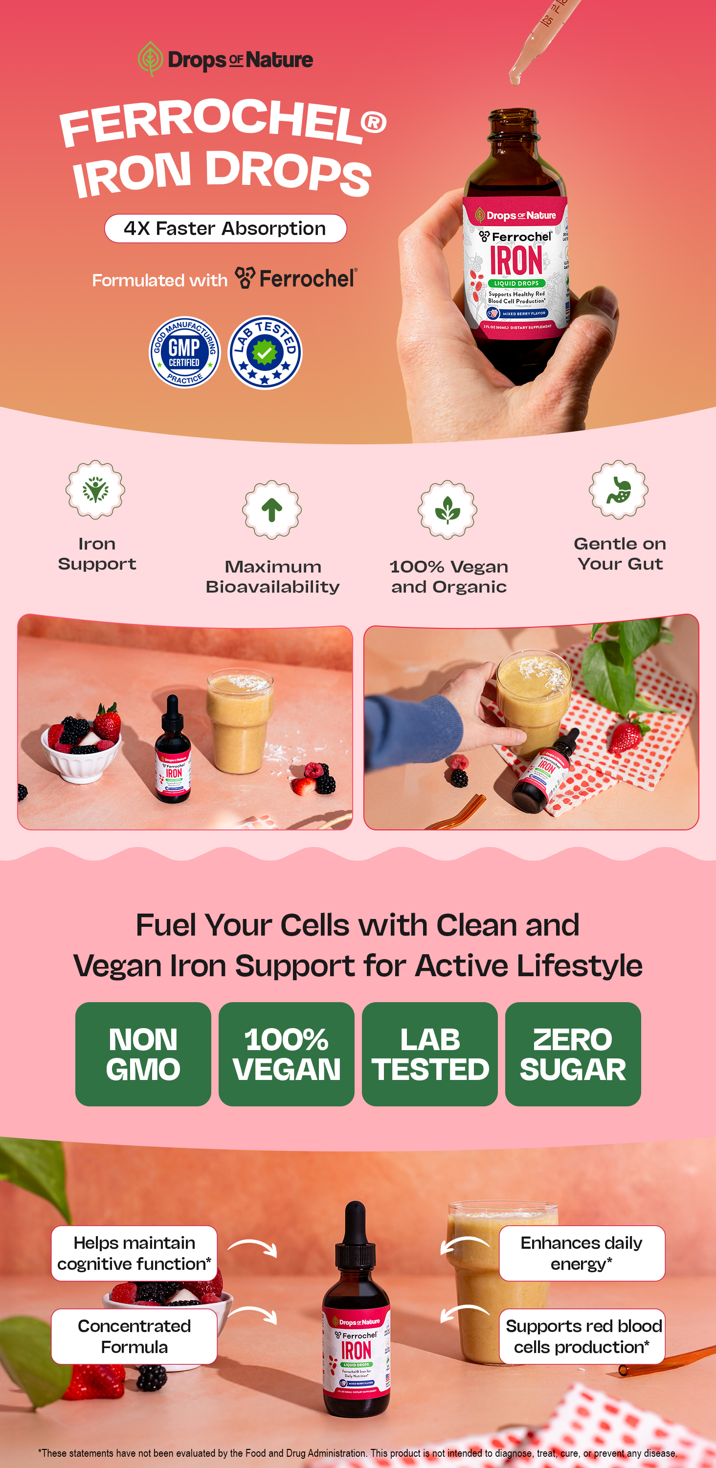 Red Blood Cell Production: Iron is key to healthy hemoglobin levels. Our drops help maintain normal iron stores, supporting red blood cell function and overall wellness - without the harsh side effects of traditional iron pills.