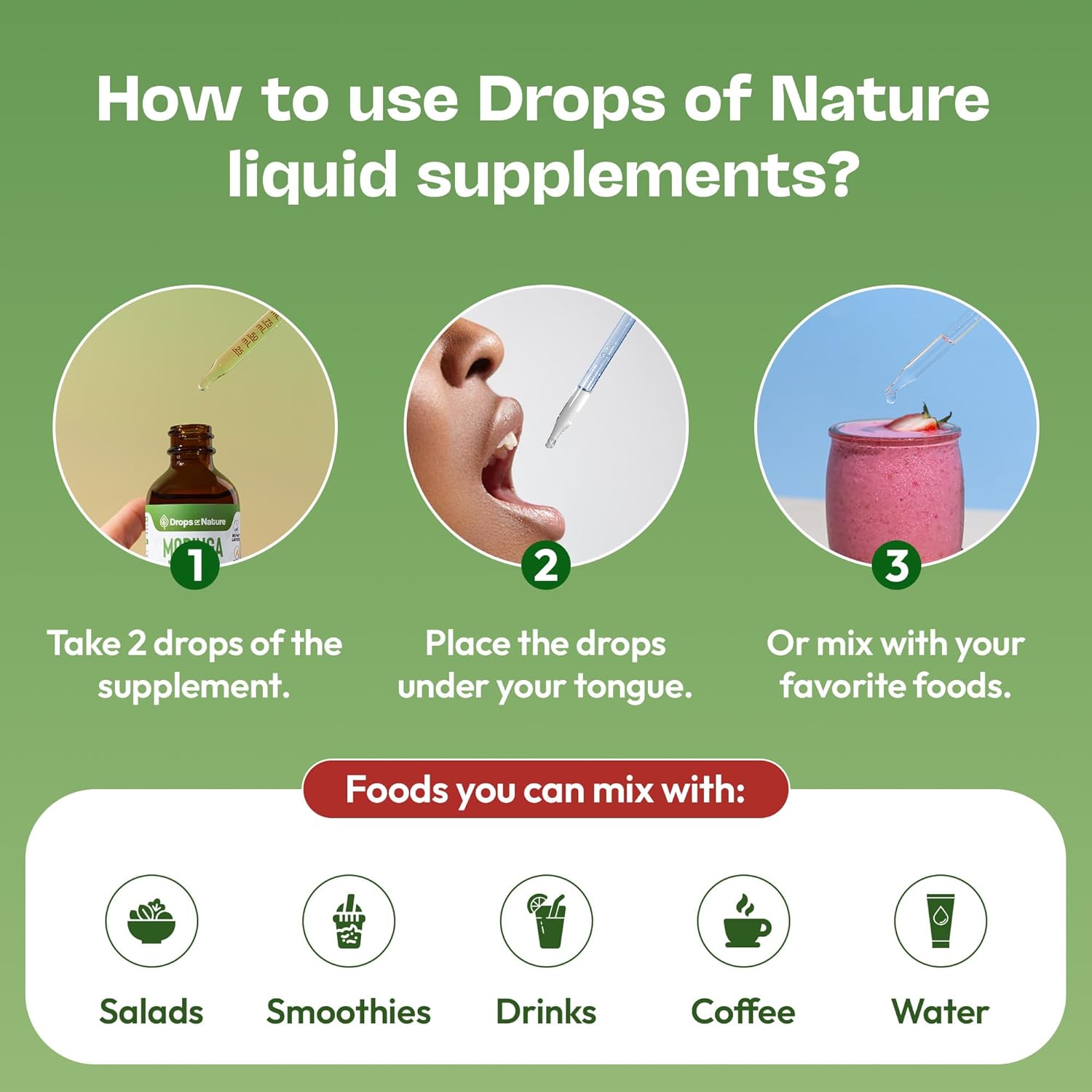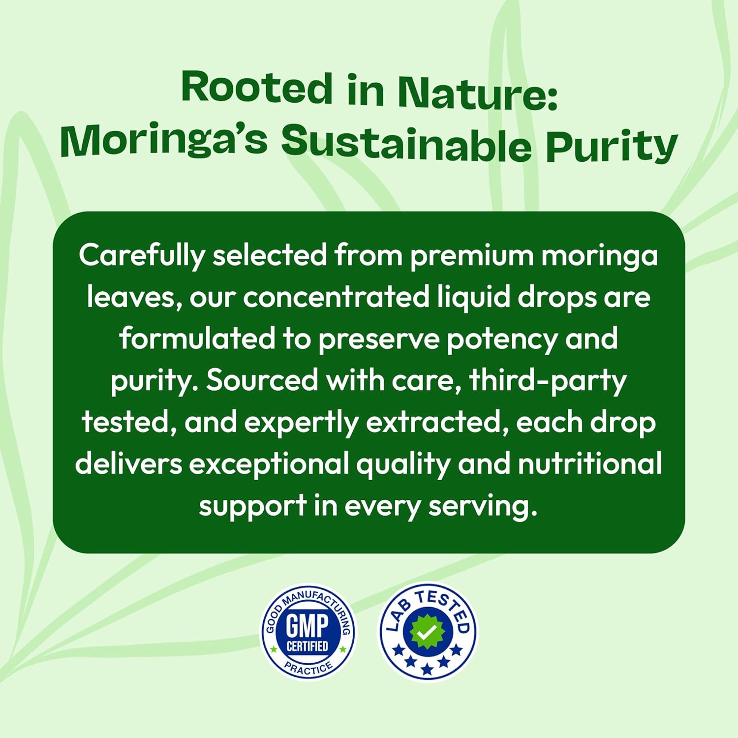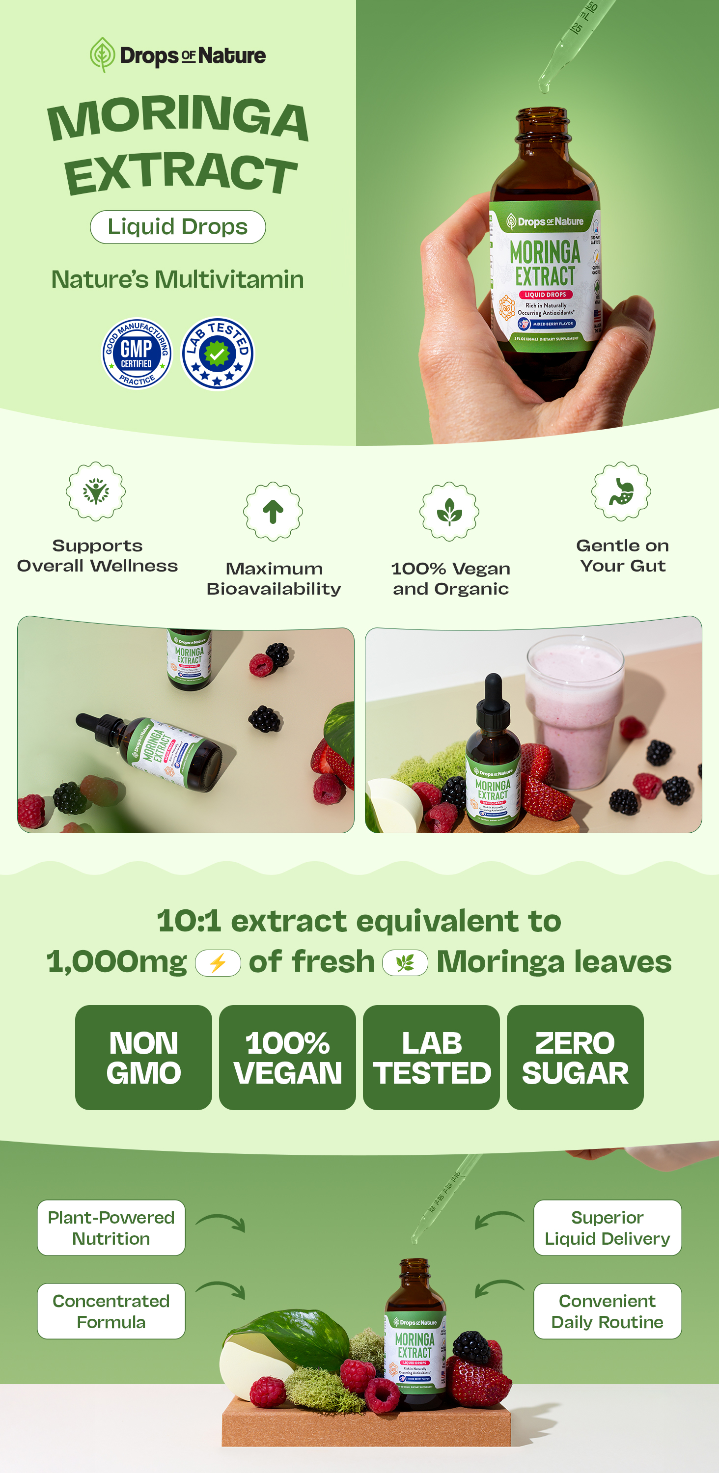 Real nutrition. Zero hassle. Add our Moringa Liquid Drops to your daily routine for a powerful boost from one of nature's most complete superfoods.