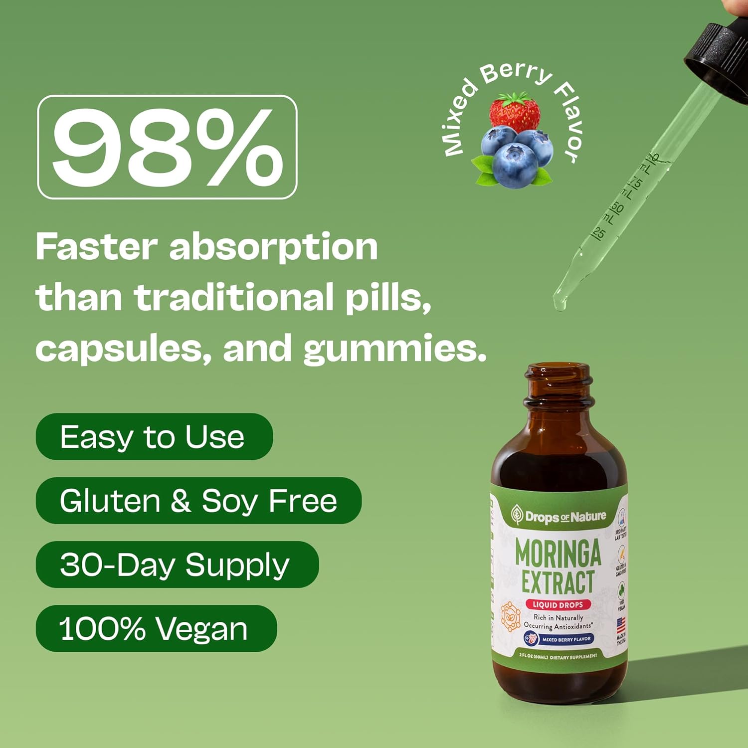 You can spill the powders, pills, and teas! Instead, try Moringa Liquid Drops that deliver the powerful nutrients of Moringa oleifera in a fast-absorbing, berry-flavored liquid formula. Known as one of the most nutrient-dense superfoods on the planet, moringa offers daily supergreen support for energy, immunity, and overall wellness.