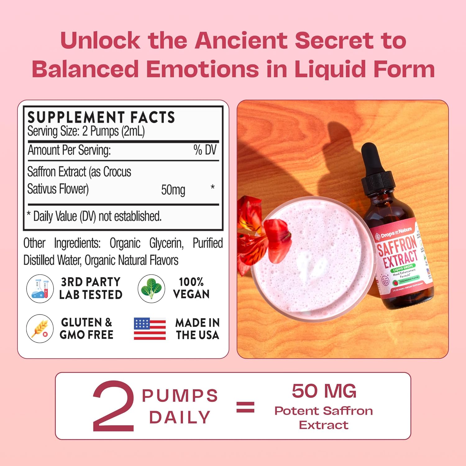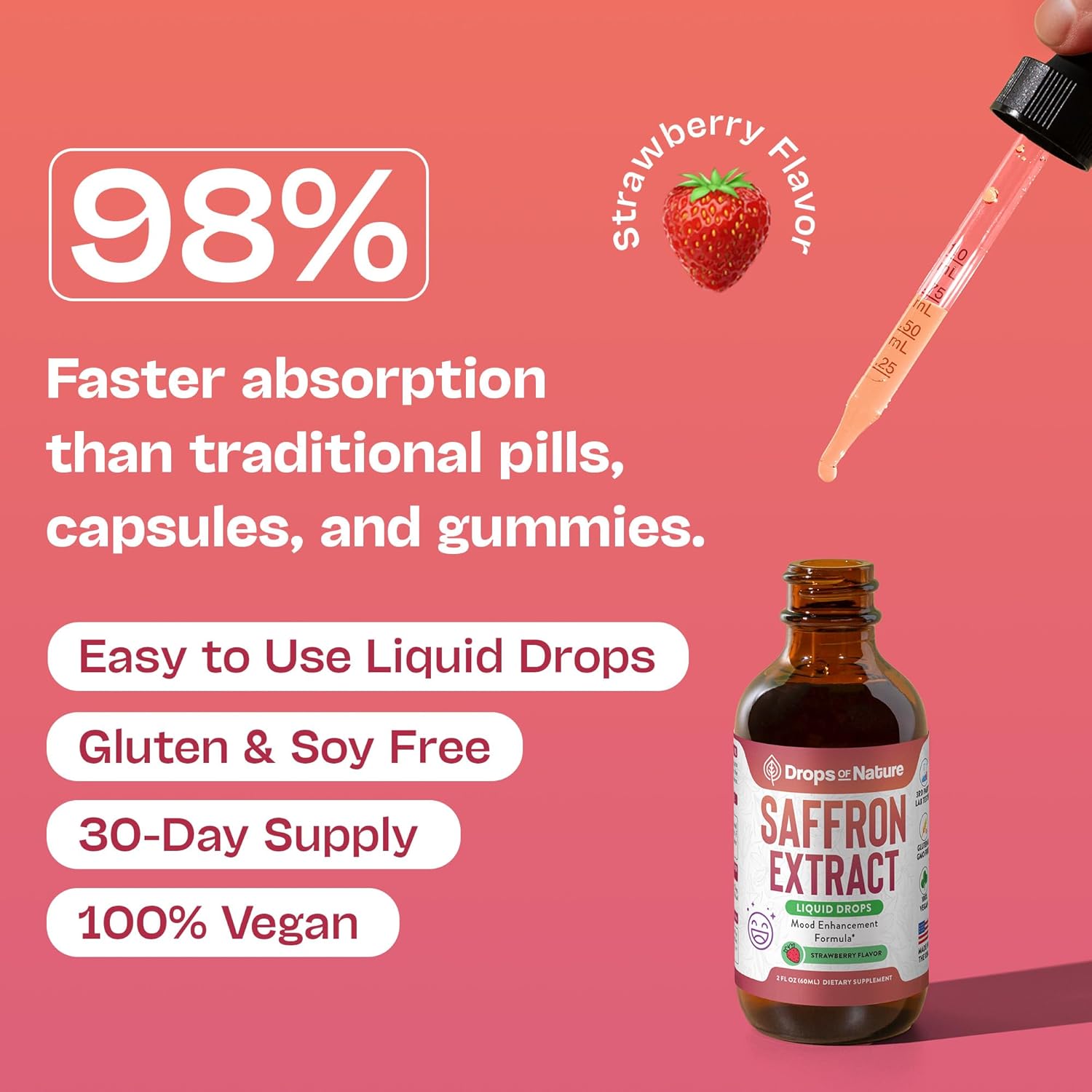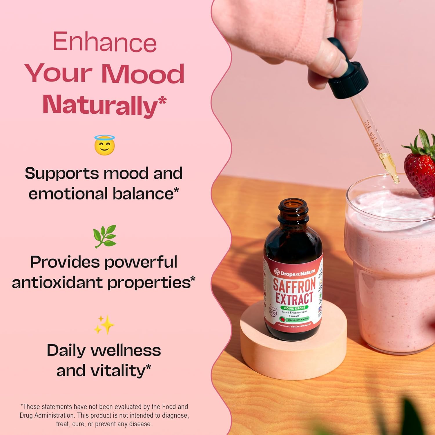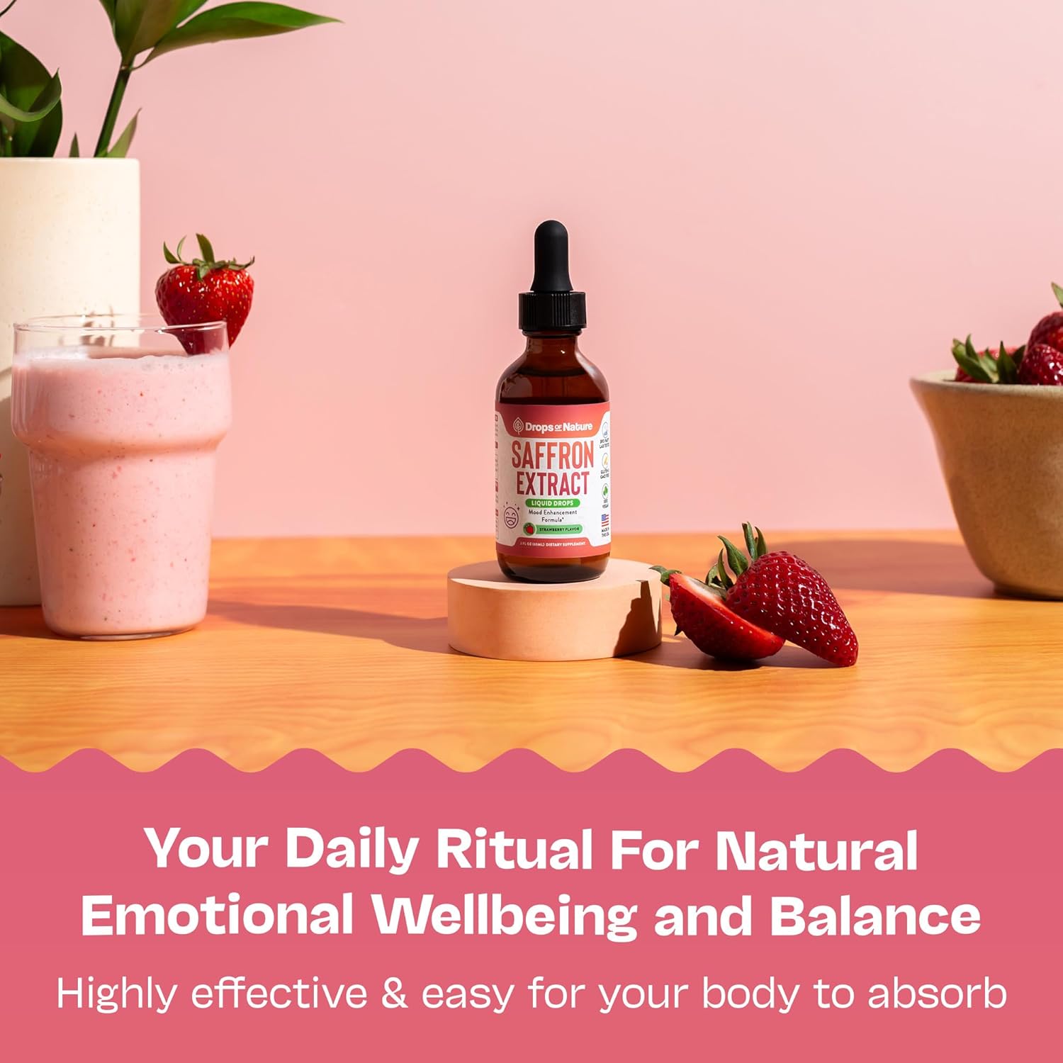 Regain that mental balance and brighten up your mood. Wellness is not only physical it is very much connected to the mind. Uplevel your well-being with our Saffron Extract Liquid Drops - a premium supplement that supports mood, mental balance, vision, cognition, and skin vitality. Harnessing the ancient power of saffron crocus, this antioxidant-rich formula offers a naturally uplifting experience with a refreshing strawberry flavor.